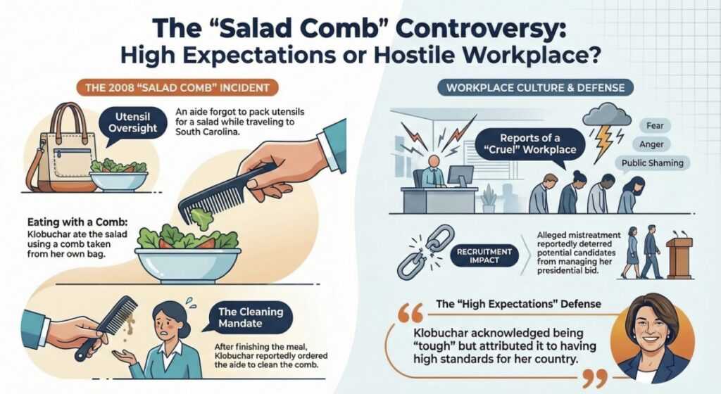 In early 2019, Senator Amy Klobuchar (D-Minn.) faced significant scrutiny regarding her management style and treatment of subordinates as she launched her 2020 presidential campaign. These allegations reached a flashpoint following reports of a 2008 incident in which the Senator reportedly ate a salad with a hair comb after berating an aide for failing to provide utensils. Beyond this specific anecdote, multiple media outlets reported a broader pattern of behavior characterized by “fear, anger, and shame.” Senator Klobuchar and her campaign have responded by characterizing her management style as “tough” with “high expectations,” while maintaining that these anonymous accounts do not reflect the experiences of her entire staff.