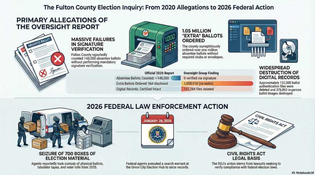 These legal and administrative actions created an environment of mounting pressure on county officials, setting the stage for direct federal law enforcement intervention. On January 28, 2026, agents from the Federal Bureau of Investigation (FBI) executed a court-authorized search warrant at the Fulton County Election Hub and Operation Center in Union City, Georgia. Agents seized a wide array of materials related to the 2020 election, including ballots, tabulator tapes, computer hard drives, electronic ballot images, and voter rolls. Eyewitnesses reported seeing agents load hundreds of boxes of records into government trucks.